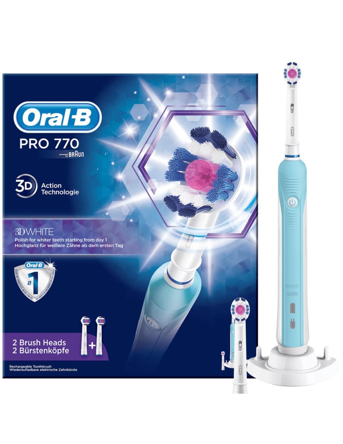 Braun Oral-B Cepillo 3D Pro 1 770 White + 2 Cabezales - 4210201124801Oral-B PRO 80285669 cepillo eléctrico para dientes Adulto Cepillo dental oscilante AzulOral-B PRO 80285669. Utilizar con: Adulto, Tipo de cepillo de dientes: Cepillo dental oscilante, Modos del cepillo de dientes: Cuidados diarios. Fuente de energÃa: BaterÃa, Tipo de baterÃa: BaterÃa integrada. Peso: 271 g. Ancho del paquete: 84 mm, Profundidad del paquete: 195 mm, Altura del paquete: 236 mm. Número de empuñaduras incluidas: 1 pieza(s), Número de cabezales incluido: 2 pieza(s), Cabezas de cepillo Incluido: 3D WhiteCaracterÃsticas:CaracterÃsticas:Utilizar con: AdultoTipo de cepillo de dientes: Cepillo dental oscilanteFrecuencia Cepillo de dientes (rotaciones): 8800 movimientos por minutoTemporizador integrado: SiDuración del temporizador: 4 x 30 sEfecto 3D: SiNúmero de modos de cepillado de dientes: 1Modos del cepillo de dientes: Cuidados diariosSensor de presión: -, YMasaje de encÃas: NoColor del producto: AzulIndicador de cambio de cepillo: NoIrrigador: NoControl de energÃa:Fuente de energÃa: BaterÃaTipo de baterÃa: BaterÃa integradaCarga rápida: NoPeso y dimensiones:Peso: 271 gEmpaquetado:Ancho del paquete: 84 mmProfundidad del paquete: 195 mmAltura del paquete: 236 mmPeso del paquete: 453 gTipo de embalaje: CajaContenido del embalaje:Número de empuñaduras incluidas: 1 pieza(s)Número de cabezales incluido: 2 pieza(s)Flosser incluido: NoCabeza limpiador de lengua: NoCabezas de cepillo Incluido: 3D WhiteAccesorio para limpieza interdental: NoDatos logÃsticos:Cantidad por paquete: 1 pieza(s)Ancho de la caja principal: 265 mmLongitud de la caja: 404 mmAlto de la caja principal: 248 mmPeso del envase completo: 3,04 kgCantidad por caja: 6 pieza(s) ¡Cepilla tus dientes con la potencia del futuro! Braun Oral-B Cepillo 3D Pro 1 770 White + 2 Cabezales - Disponible en Canarias para una sonrisa impecable y fresca todos los dÃas.Términos de Búsqueda Comunes: Braun Oral-B, Cepillo Braun, Braun Pro770, Oral-B Cabezales, Cepillo 3D White, cepillo eléctrico dental, cepillo dental oscilante, cepillo dientes 3D, cepillo dientes Oral-B, cepillo eléctrico Oral-B, cepillo dientes blanco, cepillo dientes adulto, cepillo dientes azul, cepillo dientes baterÃa, cepillo dientes recargable, ean13= 4210201124801