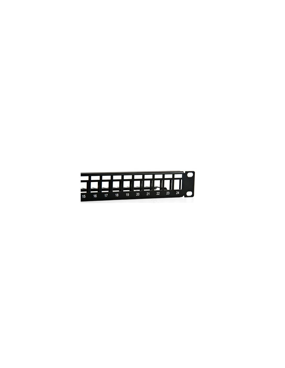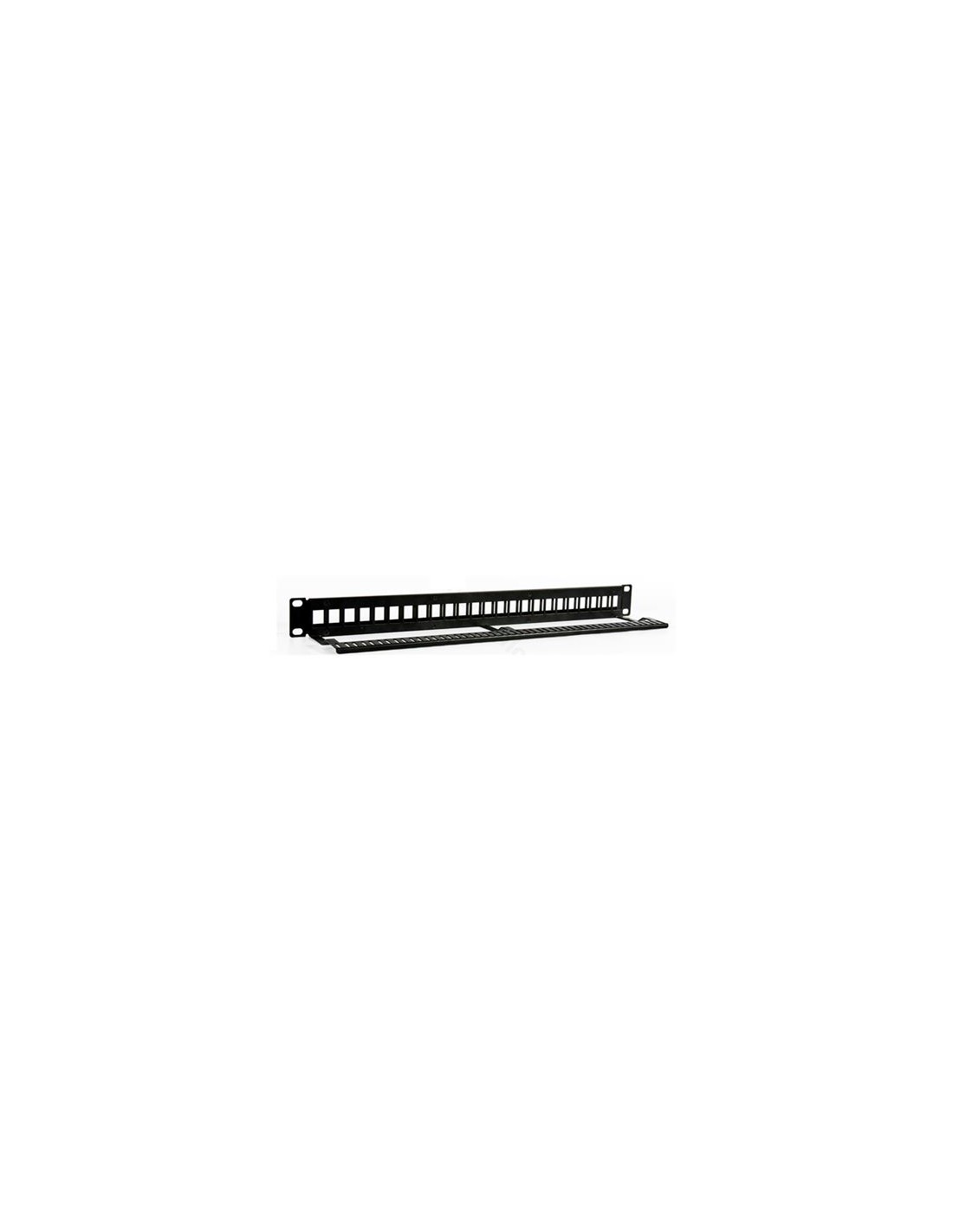 • Patch panel 24 conectores para ancho de perfil estándar de 19\" vacio, para inserción de conectores tipo Keystone y con bandeja trasera para enrutado de los cables.