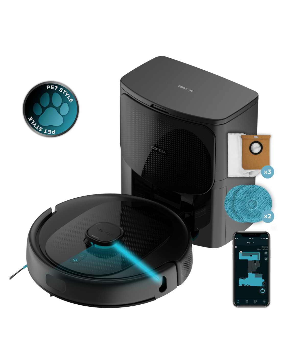 Conga 9590 Spin Revolution Ultra Power Home Robot aspirador con navegación láser. Evita objetos. 4 en 1: barre, aspira, friega y pasa las mopas. 10.000 Pa de succión. Máximo 240 minutos de autonomÃa. Fregado profesional con mopas giratorias. Cepillo de silicona, óptimo para pelo de mascotas. 1 cepillo lateral. 4 niveles de potencia de aspiración y fregado. Control APP Cecotec y asistentes virtuales.