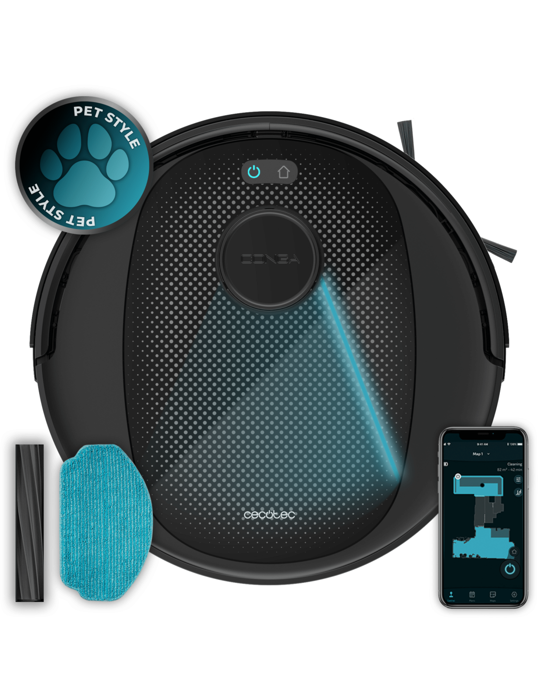 Conga 7690 Immortal Max M Robot aspirador con tecnologÃa de navegación láser. Limpieza 4 en 1: barre, aspira, friega y pasa la mopa. Potencia de succión de 5000 Pa. Hasta 220 minutos de autonomÃa. Cepillo central de silicona, óptimo para pelo de mascotas. Mopa de fregado y 1 cepillo lateral. Control APP y asistentes virtuales. Conexión Bluetooth y WiFi para redes 2,4 GHz y 5 GHz.