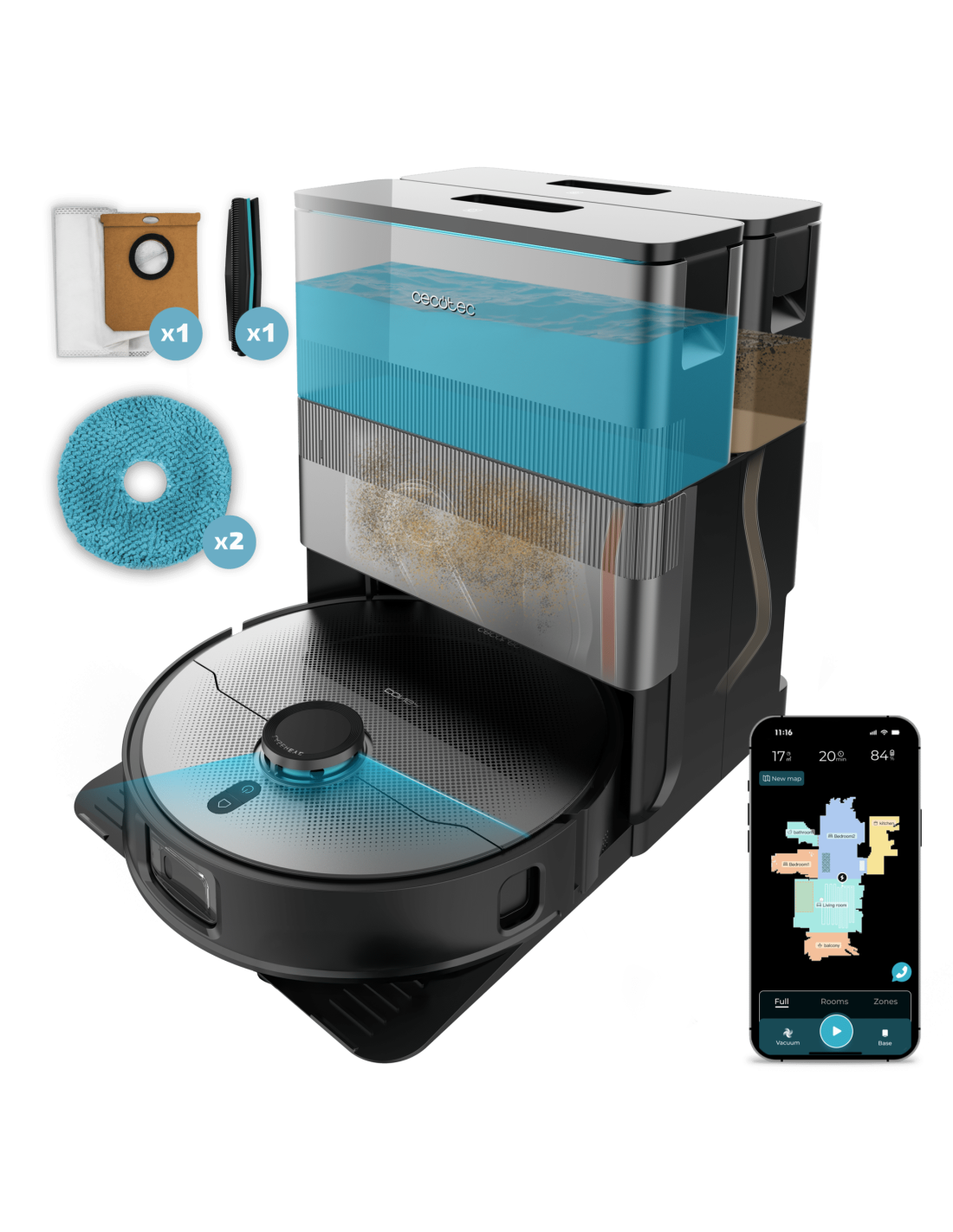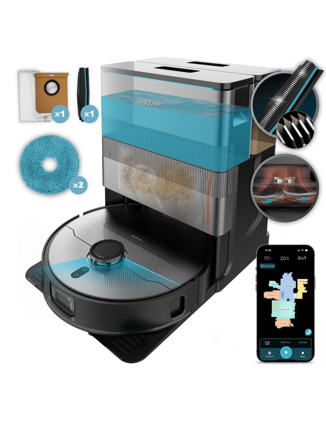 Conga X100 Robot aspirador con sistema de limpieza adaptativa. 20000 Pa de poder de succión, base 4 en 1 con desinfección. Inteligencia Artificial con cámara. Mopas giratorias elevables. Cepillo lateral y mopa extensible. App con video manager.
