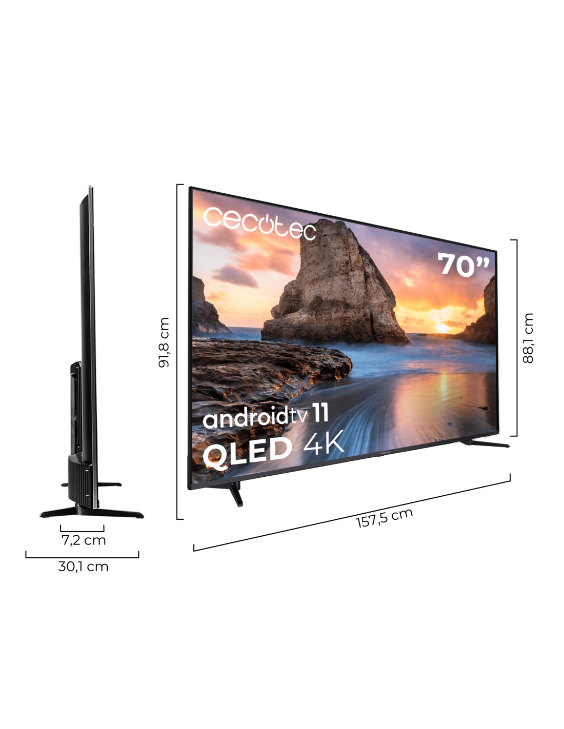TV v1+ series vqu11070+ TV QLED 4K, 70 Pulgadas, Smart TV Android 11, Dolby Vision, Dolby Atmos, HDMI 2., Atenuación local MicroDimming, HDR10, Audio 24W, DTS Virtual X + DTS X, 2 Mandos (1 smart), SubWoofer integrado, MEMC, Eye Safe, Chromecast, Miracast, Compatible Google Voice Assistant, USB PVR