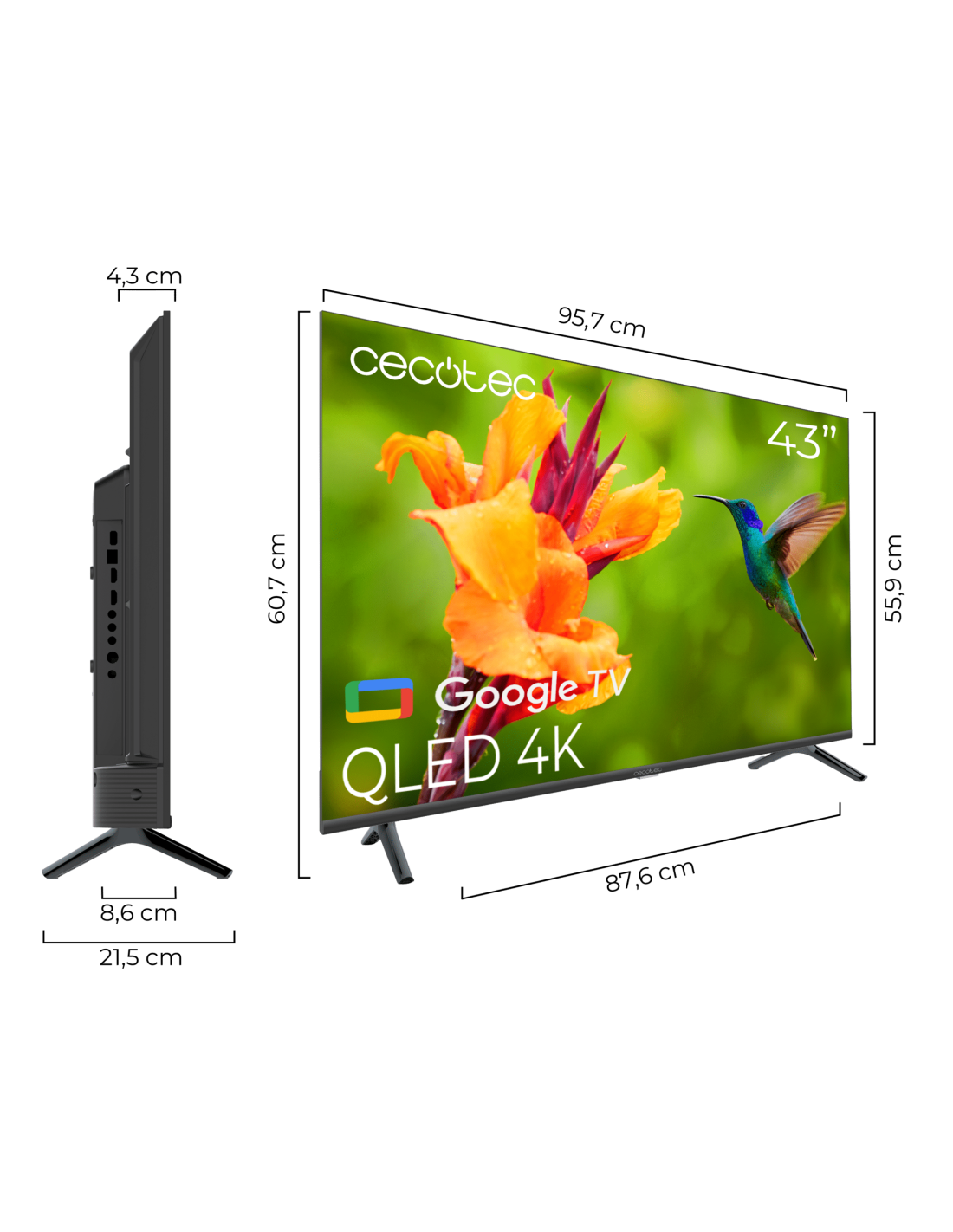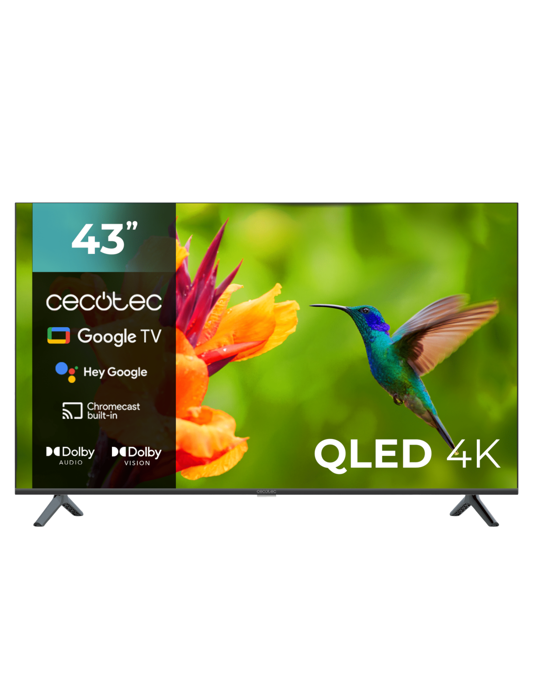 V4 series VQU40043 Televisión QLED de 43 con resolución 4K UHD, sistema operativo Google TV, Dolby Vision&Atmos, Wide Color Gammut, VRR, HDMI 2.1, USB 3.0, HDR10, 16 Gb ROM, Google Voice Assitant y Chromecast.