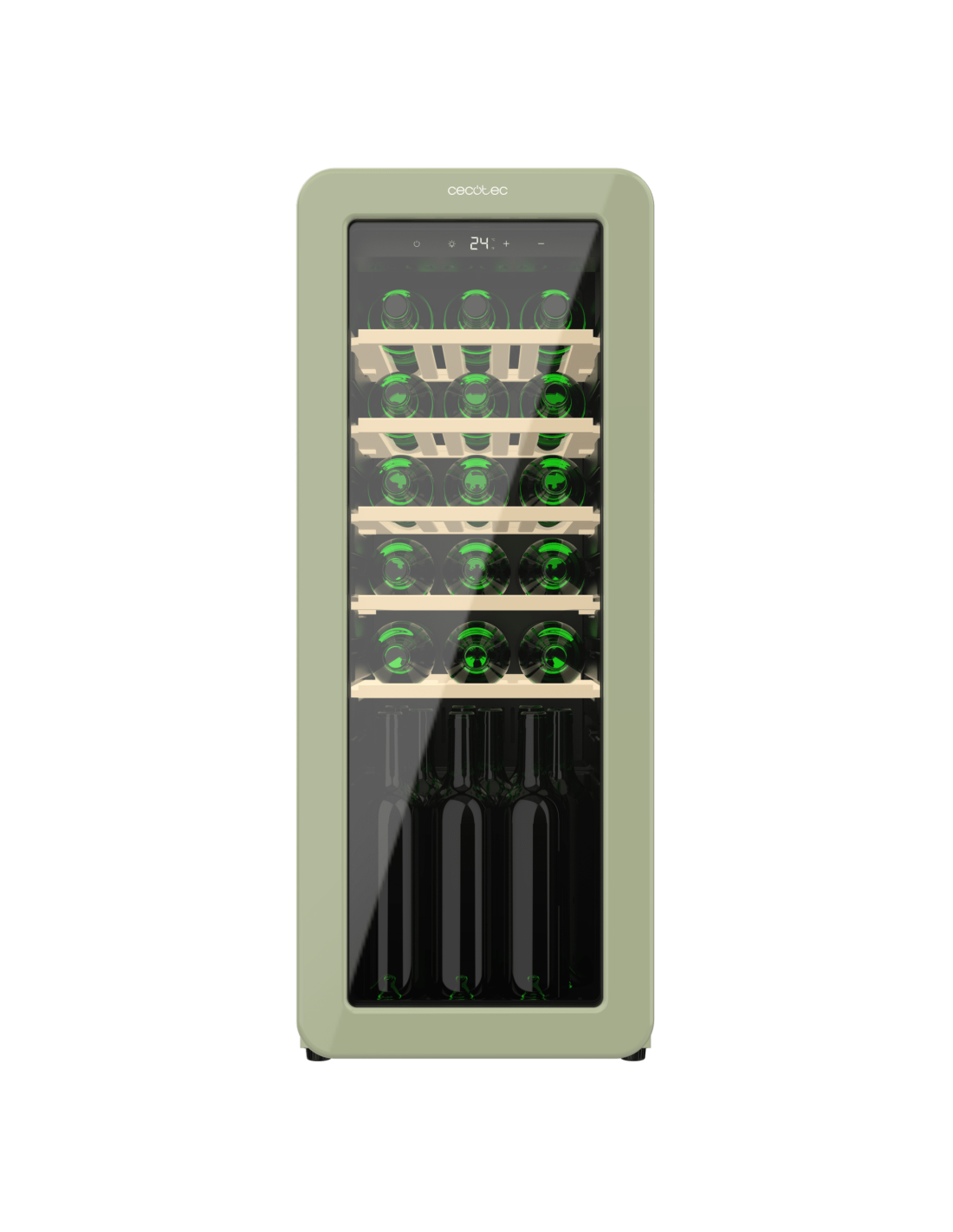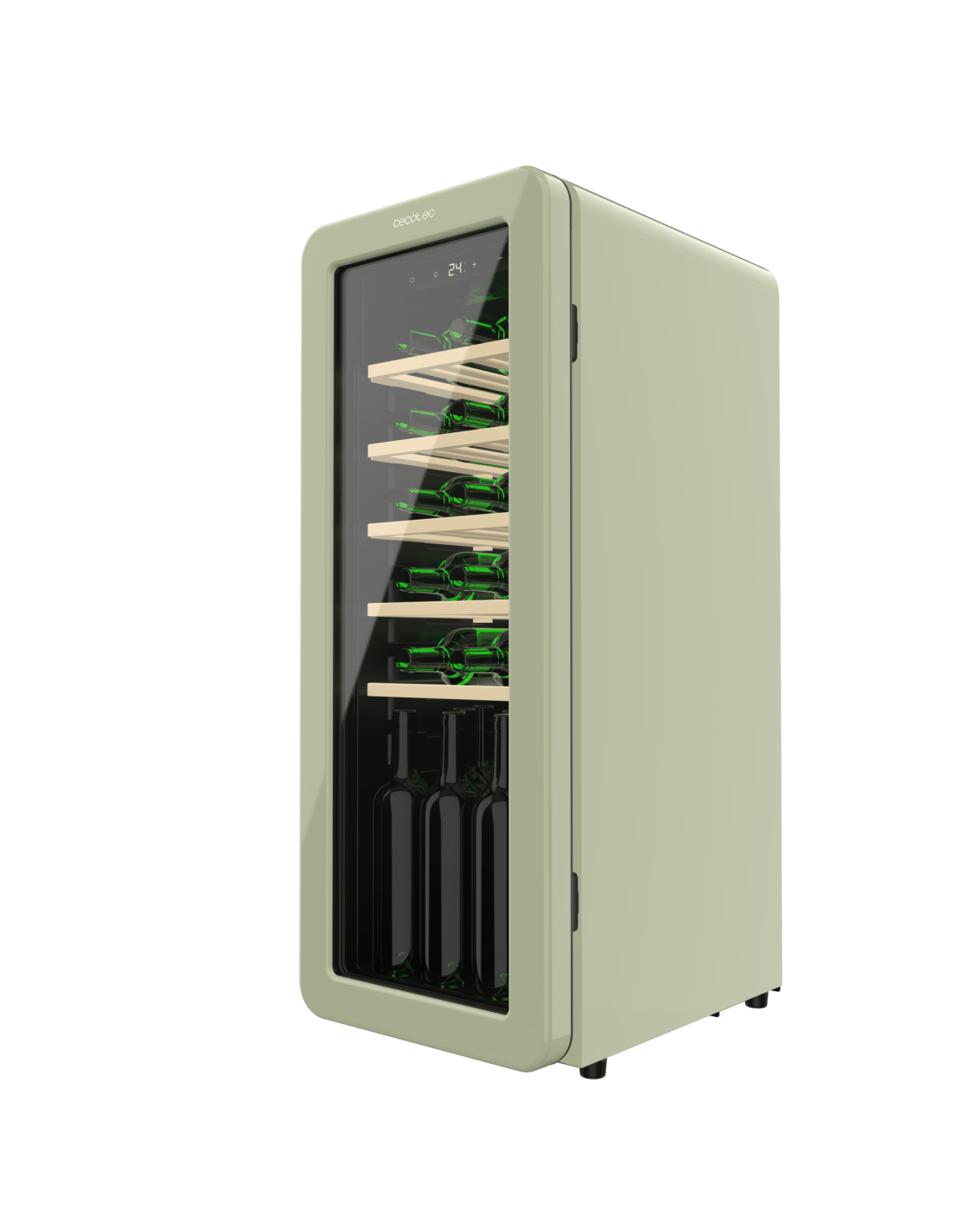 Bolero GrandSommelier Origin 24 Hit Green Vinoteca de diseño retro color verde, Capacidad para 24 botellas, Control electrónico de temperatura mediante display LED, Rango ajustable de 5 a 20ºC, TecnologÃa NoFrost, Estantes madera, Luz interior, Ventilación interna asistida por ventilador, Dimensiones de Alto 92,8cm, Ancho 36,6cm, Fondo 47,6cm